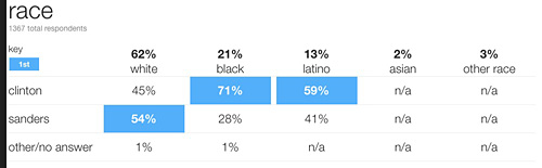 Specifically, Sanders won whites over Hillary (54% to 45%), but got socked by the black vote, which Hillary won by a whopping 71% to 28% — that’s a 43 point lead. Latinos also went heavily for Hillary, by 59% to 41%.