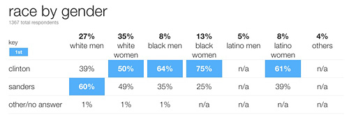 2. Sanders demographic appeal was exceedingly weak. John Aravosis, owner-editor of the popular blog Americablog, notes that exit polls showed Sanders had a narrow appeal: mostly to white men. This further explains the kinds of states Sanders has generally won and lost in. He writes: