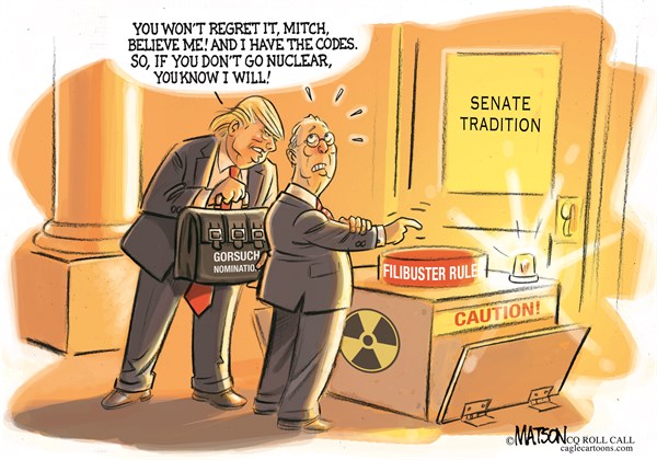 And that’s why the minority Democrats are currently up the creek. They can fume all they want about how the GOP stole Merrick Garland’s seat – justifiably so – but their options for blocking Trump nominee Neil Gorsuch are basically nonexistent. Senate rules require 60 votes for passage, which means that Mitch McConnell needs eight Democrats to say yes. But if Democrats dig in, McConnell can always change the Senate rules and put Gorsuch on the court with a simple majority vote – 51 Republicans saying yes, no Democrats needed.