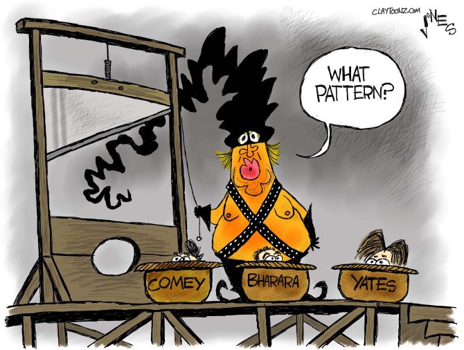 When acting Attorney General Sally Yates warned Trump about National Security Adviser Michael Flynn, it took Trump 18 days to fire him. He only fired Flynn when the Post got wind of it, and continues to defend the guy and express resentment he was made to fire him. Instead of firing Flynn immediately, he fired Yates. Later he fired U.S. Attorney Preet Bharara whose jurisdiction covered Trump Tower and was reportedly looking into foreign banks with ties to Trump and stock deals made by Trump’s Health and Human Services Secretary, Tom Price. Now he has fired the man who heads the department investigating his campaign’s collusion with the Russian government.