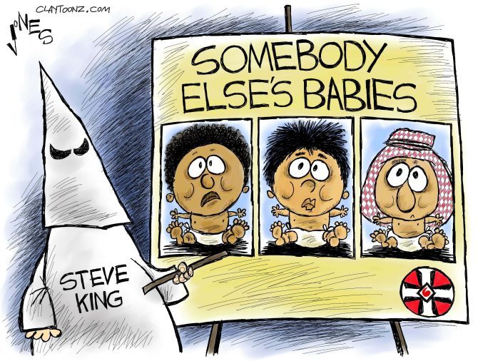 Congress’ most cuddly racist Steve King from Iowa (who “used” to keep a Confederate flag on his desk) was at it again Monday. He tweeted support for a xenophobic politician in the Netherlands with “We can’t restore our civilization with somebody else’s babies.”