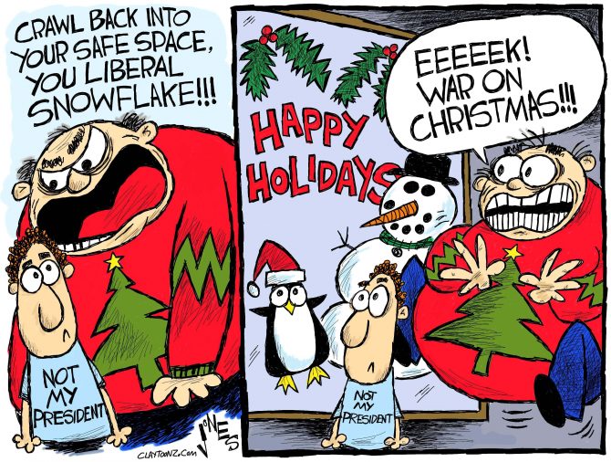 I always find it hypocritical when I hear and see conservatives accuse liberals of being whiny and ultra sensitive. Really? This from the bunch that creates persecution for themselves? They come up with the “War On Christmas” because they’re threatened when someone says “happy holidays” or “seasons greetings.” They worry that white people aren’t catching all the breaks anymore. They become outraged if Baby Jesus isn’t on a coffee cup. Hell, they won the election and they’re still whining about it. They really hate when it’s pointed out that Hillary Clinton received more votes than Donald Trump. Even Donald Trump can’t stop tweeting out excuses about it.