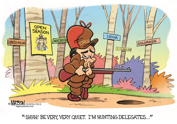 Cartoon: Ted Cruz Hunts for Delegates April 12, 2016 by CAGLE CARTOONS Leave a Comment RJ Matson, Roll Call See great cartoons by all the top political cartoonists at http://cagle.com.