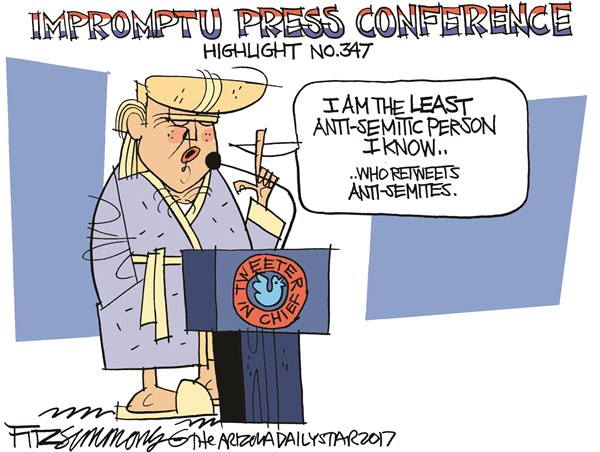 Cartoon: Trump Press Conferemce Anti-semitism February 17, 2017 by CAGLE CARTOONS Leave a Comment David Fitzsimmons, The Arizona Star This cartoon is licensed to run on The Moderate Voice by Cagle Cartoons.