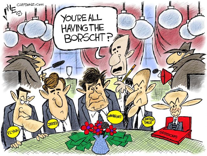 Today Manafort is under investigation by the CIA, FBI, NSA, Director of National Intelligence, and the financial crimes unit of the Treasury Department. I’m pretty sure he’s wanted for questioning by the Girl Scouts for putting his Tagalongs money into a Cyprus bank, and still owes Blockbuster for rewinding fees.