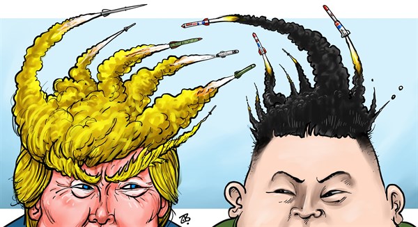 Little Un, if you think this American president is stable like his predecessors, I refer you to his Twitter account. He has sent 13,321 tweets with exclamation points, 864 tweets with two exclamation points, 432 with three, 146 with four and 57 with five (the last one, in August: “#WheresHillary? Sleeping!!!!!”). Trump’s single greatest exclamation in recent years — 15 points — was in 2014: “This cannot be the the [sic] Academy Awards #Oscars AWFUL!!!!!!!!!!!!!!!”