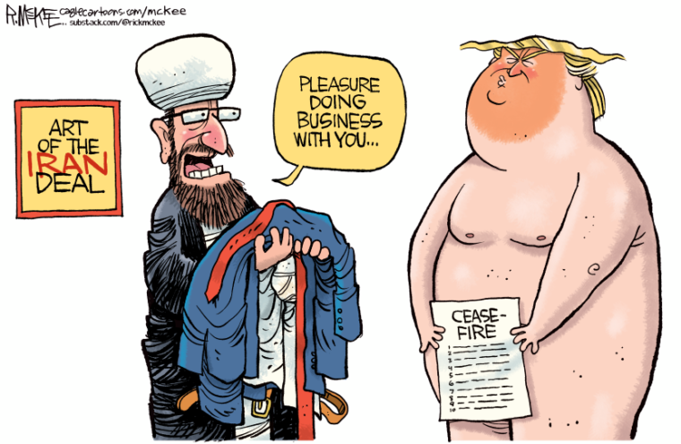 The Bulwark’s Charlie Sykes wrote: “Trump’s climb-down from Armageddon was not a TACO (Trump Always Chickens Out] — it was a complete strategic defeat. Despite the predictable bluster and claims of ‘complete and total victory,’ Trump abandoned his war objectives and left Iran in a stronger strategic position than before the war began.”