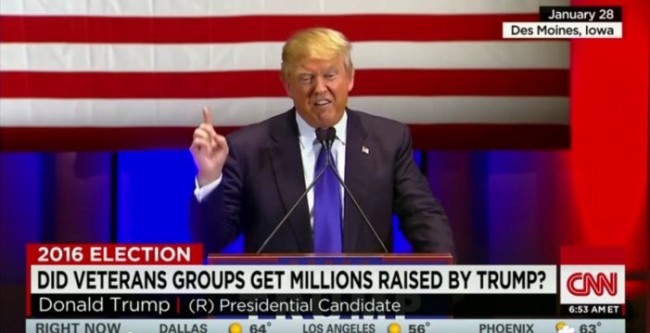 Isn’t it time to just come and and state the facts? Republican to-be-sure 2016 Presidential nominee Donald Trump lied when he skipped the Fox News debate in January, ran a televised fund-raiser event at the same time to benefit veterans, and announced that he had personally given $1 million to veterans groups. According to the Washington Post, he donated the money MONDAY NIGHT as the clamor (especially from the Post, which has a long record of journalistic fearlessness) over what happened to all the big bucks he announced he had raised for veterans grew.