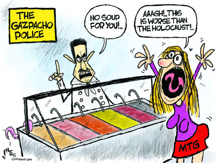 I knew there was going to be a lot of Soup Nazi jokes after Marjorie Taylor Greene had a flub and said “gazpacho” instead of “Gestapo” in one of her bewildering brain-dead yee-haw rants. But then I thought that it’ll be OK to use Soup Nazi in a cartoon, despite all the memes and possibly other cartoons because everyone else would miss the context.