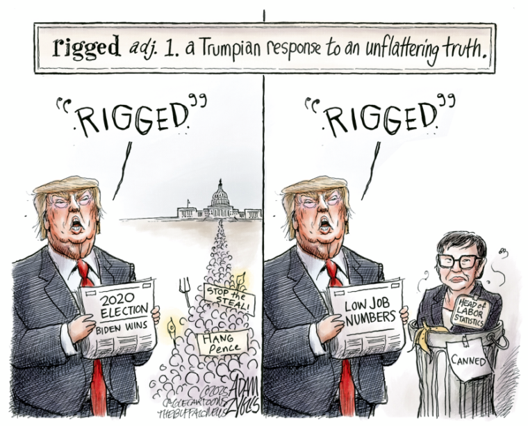 In fact, we have a new trifecta. On Oct. 26 he lied that Joe Biden’s win was “the biggest SCANDAL in American history!” Last week he lied the 2020 election was “a rigged election. Now everyone knows it. It’s gonna come out over the next couple of months, too, loud and clear.” And at his batty rally, he lied that he won Pennsylvania in 2020, even though every judge at the time said he lost it.