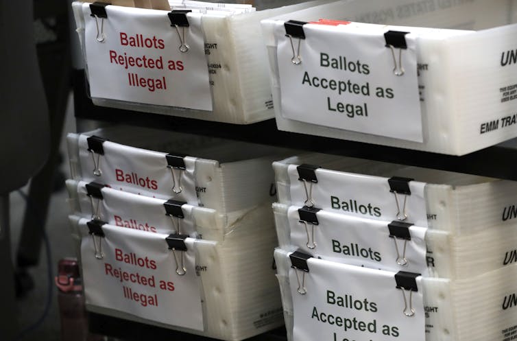 Mail-in ballots, however, aren’t automatically accepted as in-person ballots are. Rather, they can be rejected if they have signature defects on their return envelopes. Unless cured by voters – which means that voters fix the signature errors on them – these submitted ballots will be rejected.