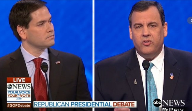 During Saturday night’s debate, Rubio said, “And let’s dispel once and for all with this fiction that Barack Obama doesn’t know what he’s doing. He knows exactly what he’s doing.” He said a second time, “Let’s dispel with this fiction that Barack Obama doesn’t know what he’s doing. He knows exactly what he’s doing.” When he repeated it a third time, Chris Christie ripped into him, calling it the “memorized 25-second speech.” Rubio made a similar remark bashing Obama a fourth time, later in the debate.
