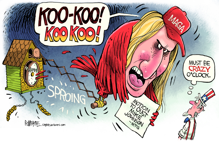 MARJORIE TAYLOR GREENE CRAZY O’CLOCK (CARTOON) March 24, 2024 by CAGLE CARTOONS Leave a Comment by Rick McKee, CagleCartoons.com
