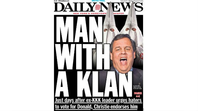 In it’s true tabloid style — a style accentuated the past year in a series of anti-Trump covers — the New York Daily News put New Jersey Gov. Chris Christie’s endorsement on the cover, depicting him as someone now associating with the Ku Klux Klan.
