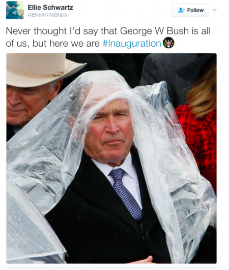 Bush’s endearing struggle with his poncho at the event quickly became a meme, prompting many Democrats on social media to admit that they already pined for the relative normalcy of his administration. Following Trump’s short and dire speech, Bush departed the scene and never offered public comment on the ceremony.