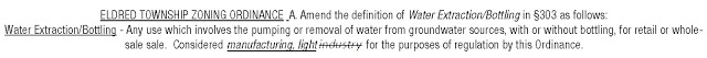 The amendment benefitted Nestlé in its efforts to get township approval to sink two bulk extraction wells on private property and pump 750 million gallons of water over a 10-year period at little cost and for enormous profit — estimated at upwards of $3 billion — for its Deer Park Spring Water brand from the fragile aquifer under Kunkletown village in the heart of Eldred.
