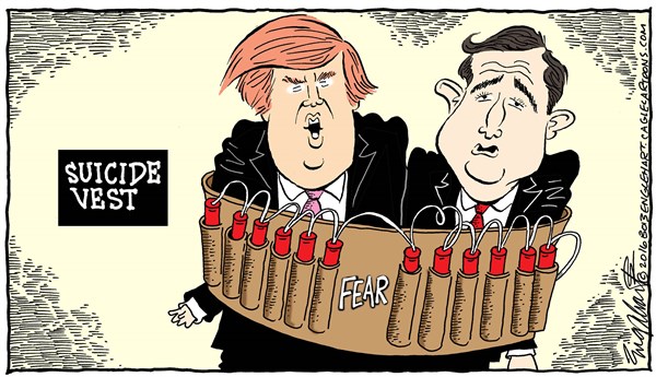 It’s quite possible that Trump’s baggage will ultimately defeat him, that fear of his ascent will trump his attempts to exploit fear of terrorism. Distaste for the guy still runs high, even in Republican circles. After Trump threatened to smear Ted Cruz’s wife (don’t ask), former George W. Bush speechwriter Michael Gerson posted this appeal to his GOP brethren: “How could anyone, anyone, support this vile man….If Trump were somehow, God forbid, to be elected president, he would immediately defile the office, and surely abuse it.”
