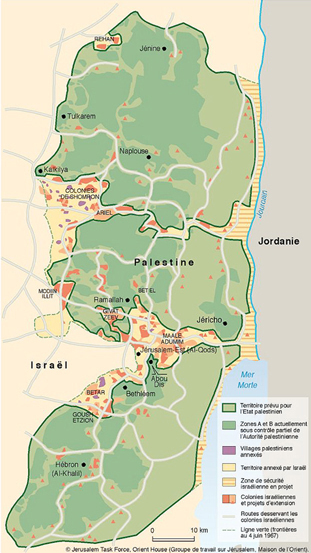 There were no maps produced at the Barak, Clinton Arafat peace negotiations so there is some differences of what the actual offer was but this is the best representation I believe. When people say that the Palestinians were offered 90+% of the West Bank and they turned it down, they are only partially correct. The yellow areas represent “temporary” Israeli security zones. The security zones represent 20-25% of the West Bank depending on whose perspective you believe. The Security zones were supposedly sovereign Palestinian land (that is how one gets to 90+% of the West Bank) but controlled by Israel for the next 25 years. After 25 years the Security Zone issue was supposed to be renegotiated.