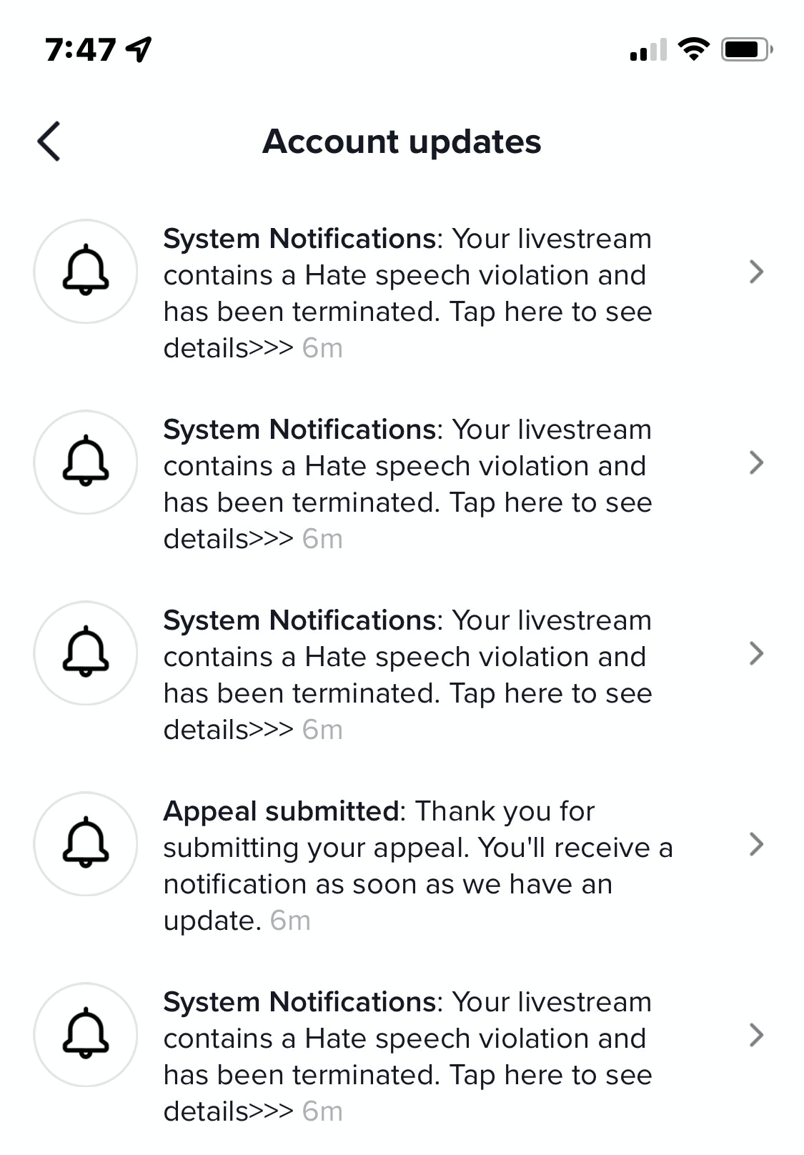 Note the multiple messages from TikTok after they censored me, which likely means multiple complaints about “hate speech” were registered”: