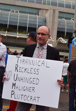One, expressed by Democrat Robert Dillinger of San Diego, was spelled out on a sign he carried spelling out the acronym Trump. It read Tyrannical; Reckless; Unhinged; Maligner, Plutocrat.”