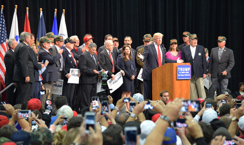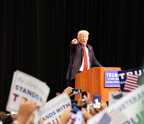 Trump called up a group of veterans to stand behind him and be recognized, among them Republican U.S. Congress Members Darrell Issa and Duncan Hunter, both of whom have endorsed him. Another elected official who spoke in Trump’s behalf was Assemblywoman Melissa Melendez of Riverside County, a U.S. Navy veteran.