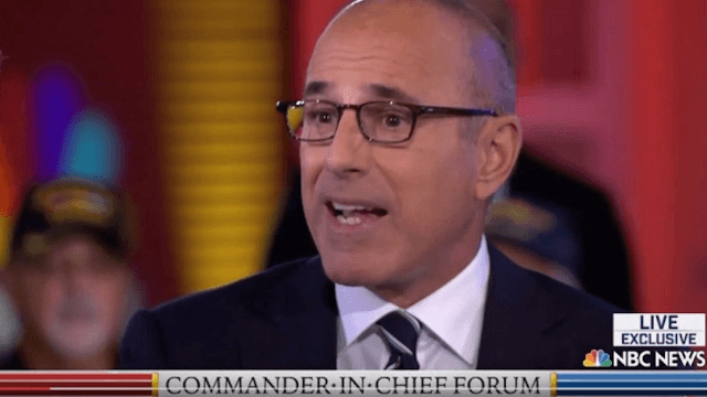 #1: Not just the reaction of journalists (which means you automatically omit Shaun Hannity, Rush, etc.) but a CNN story quoting a “NBC Executive” as giving a brutal thumbs down on how Lauer did (or, rather, didn’t) do his job. Lauer’s performance — where he seemingly interrupted Clinton, threw tough questions at her and grilled her consistently, in contrast to some easy (news professionals would say sloppy) questions tossed to Trump — was called by NBCers “a disaster.”