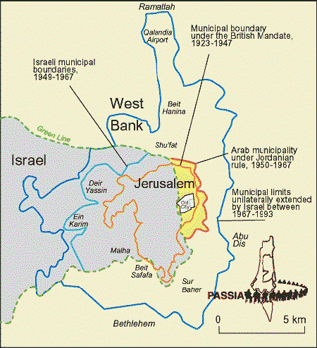 However, Israel has been expanding Jerusalem’s municipal boundaries for years and now are outlined by the dark blue lines. This is the area Israel considers its undivided capital leaving no room for Palestinians to part of an area just outside the yellow line as their capital in what was traditional Arab East Jerusalem. This expansion of Jerusalem was done not only to annex part of the traditional west bank but also extend the municipal lines north to the city limits of Ramallah and south to the city limits of Bethlehem to prevent those two cities from encroaching closer to traditional Jerusalem.