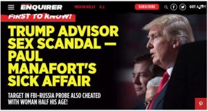 Manafort’s legal woes include failing to register as a foreign agent with the Justice Department, which he did retroactively in June, the stink emanating from his $10 million a years deal with Putin pal and oligarch-mobster Oleg Deripaska to help rehabilitate Putin’s image outside of Russia, and suspicion of money laundering involving New York real estate investments and his numerous transactions with the Bank of Cyprus, the offshore haven for money laundering by Russian oligarchs and mobsters. There may be the skeletons that his daughter alluded to, and now even the National Enquirer, the president’s favorite sleazy supermarket tabloid, has turned on him.